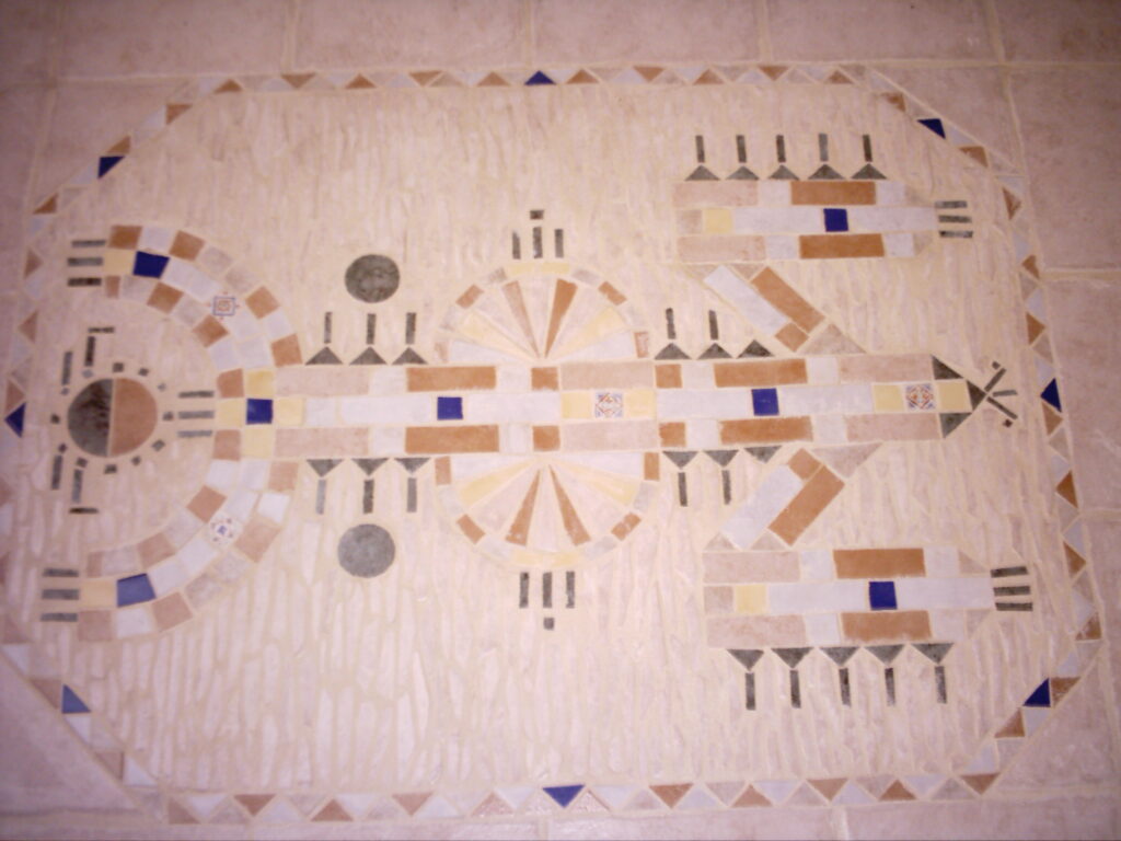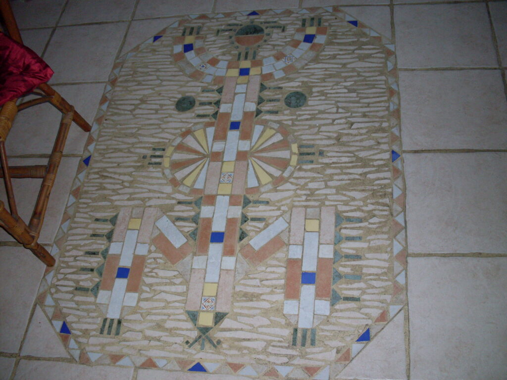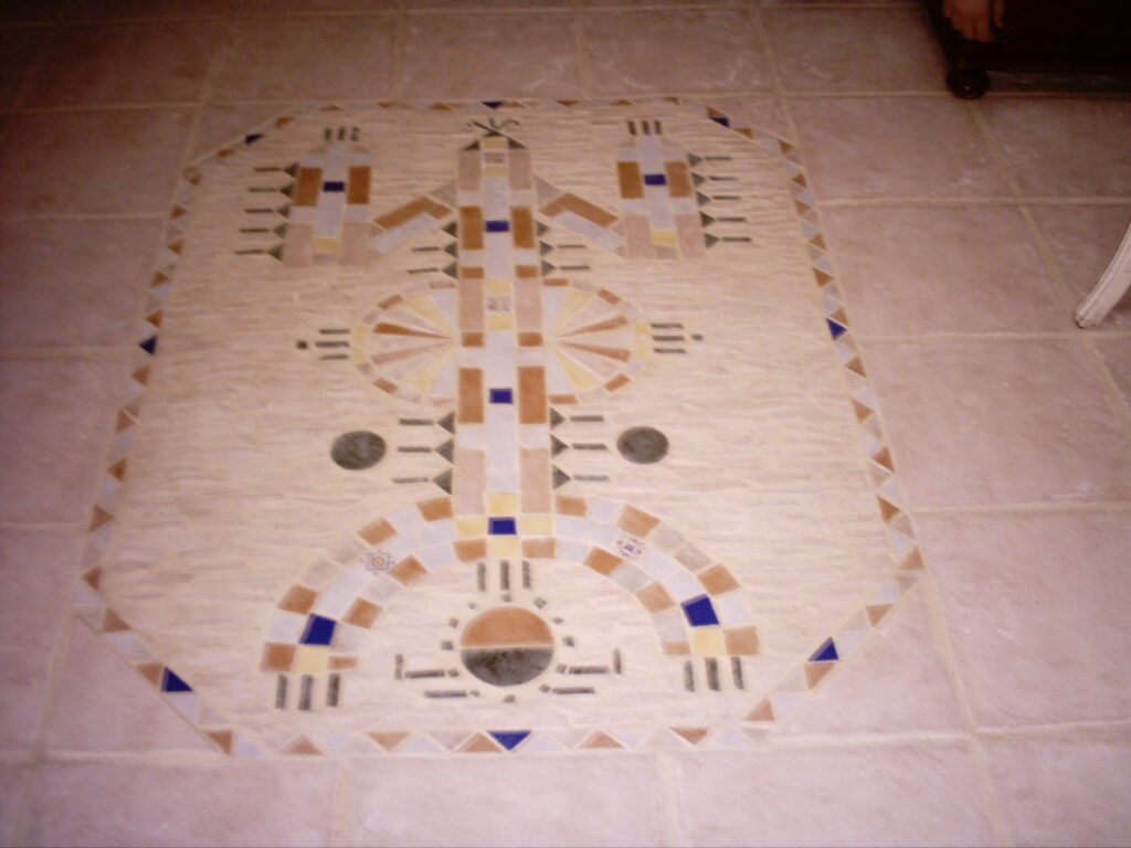 Cette mosaïque a repris en polychromie un dessin de Tamazgua (prononcer Tamazra) déesse de la fécondité berbère de l’antiquité.