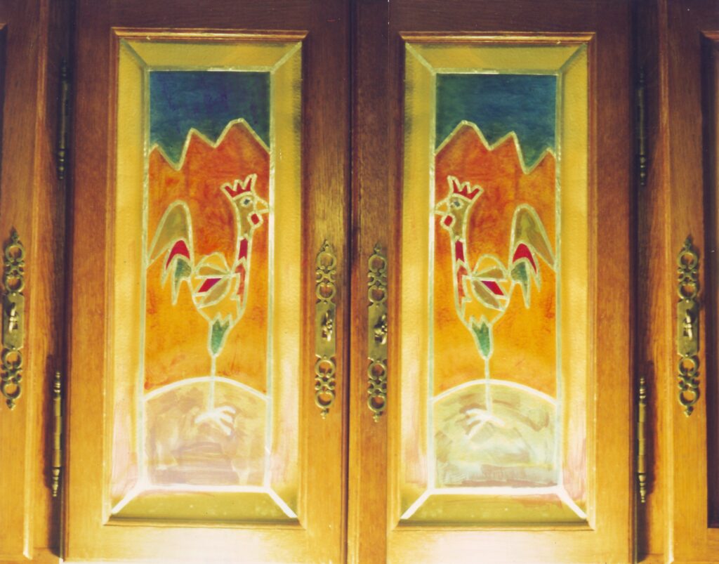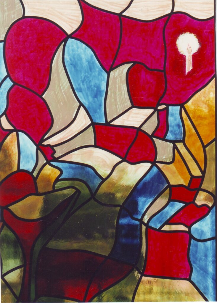 Vitrail réalisé d’après la maquette (du même nom) présentée dans les tableaux acryliques.