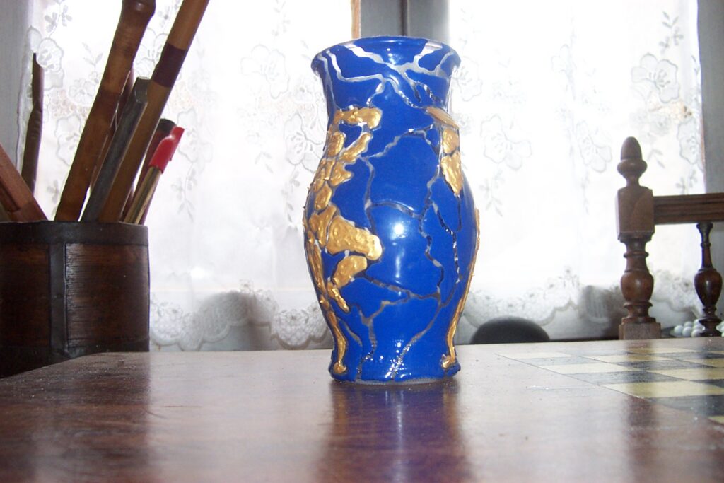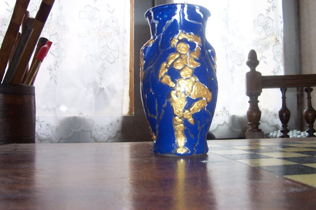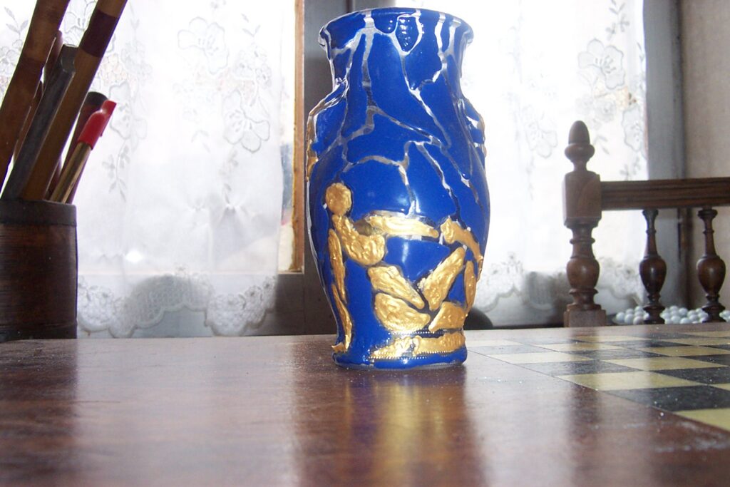 émaux basse température sur un petit vase, séparés par du vide pour provoquer ce vitrail inversé ou bien suggérer un vase brisé resté cohérent.