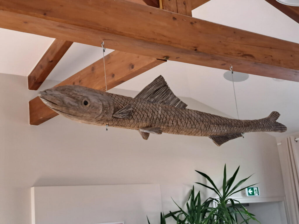 Ce grand bois flotté d’un peu plus de 2 mètres a un jour amerri dans l’atelier de l’artiste en disant : « fais de moi une sardine » . Le résultat est désormais visible, trônant sous une poutre maîtresse, au plafond de la salle des mariages et du conseil municipal de la mairie de Brem sur Mer. Destination logique puisque nous sommes en plein pays de la sardine de Saint Gilles. Notons au passage qu’elle est la petite cousine d’une certaine sardine ayant jadis bloqué le vieux port de Marseille.