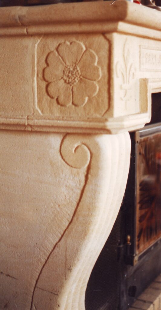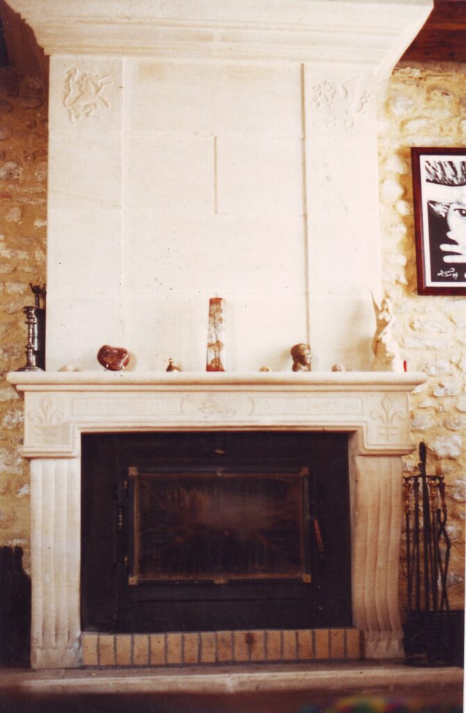 « Réalisée en pierre de Saint Maximin dans notre ancienne demeure du début du 17ème siècle, dans le Vexin, restaurée par nos soins dans son style renaissance. J’ai gravé, dans les cartouches du linteau « Rara avis in terris – Omnia vincit amor » (oiseau rare sur la Terre – l’amour triomphe de tout). La rose médiévale à cinq pétales en forme de cœurs symbolise notre famille et la salamandre couronnée mes origines dans le Val de Loire »