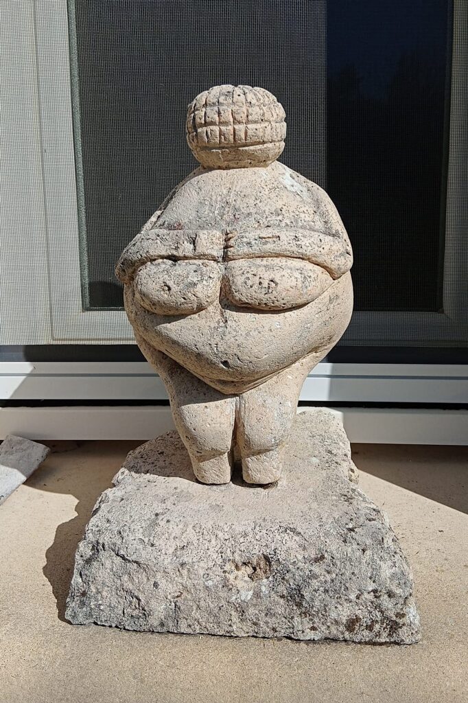 Cette sculpture, d’inspiration néolithique, représente la déesse mère primordiale, bien bafouée à notre époque moderne qui la dénature par tous les moyens possibles. Cette sculpture a été patinée et vieillie pour lui donner cet aspect ancien et archéologique.